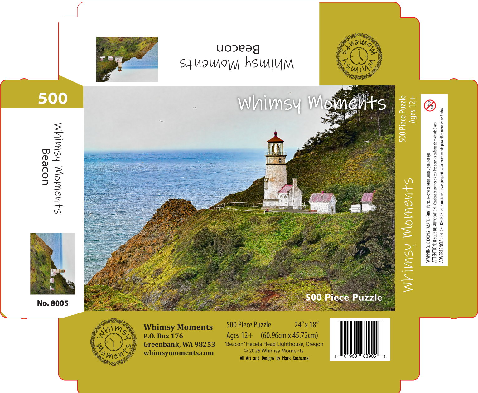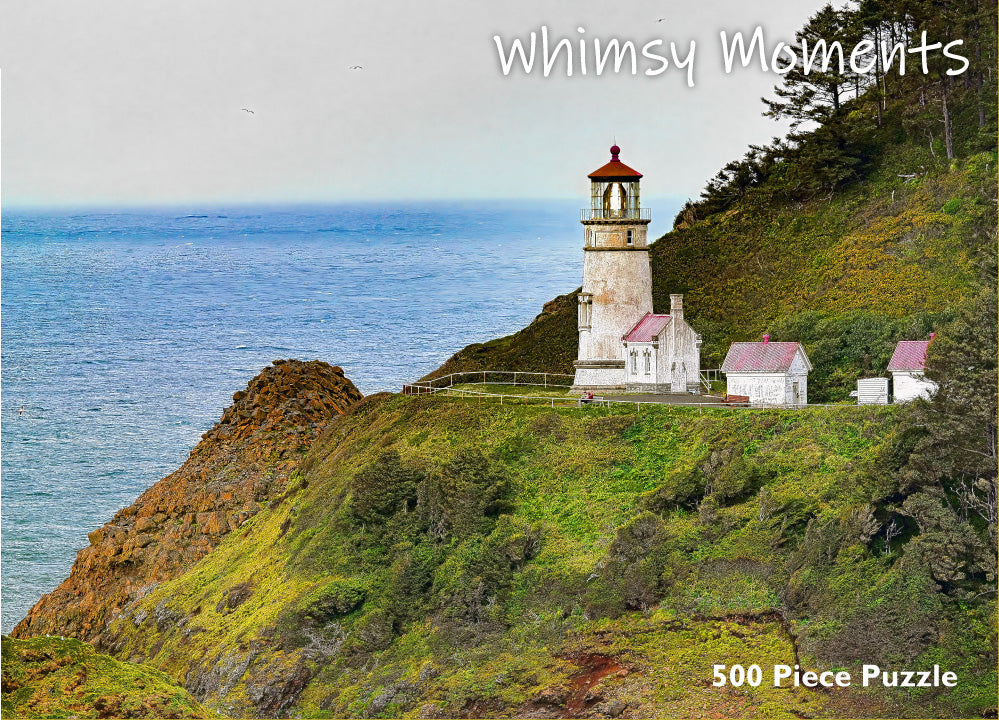 A 500-piece puzzle of the spectacular Heceta Head Lighthouse that sits over 200 feet above the water on rocky Oregon Coast found north of Florence and south of Yachats.
