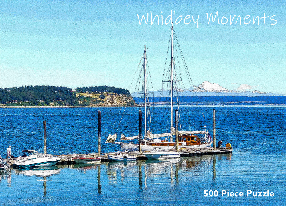 A 500-piece puzzle of the boats at the Coupeville Pier dock in Penn Cove including the historic 1925 two-masted schooner Suva. Boating for fishing, sightseeing, work, and travel are popular across the Puget Sound.