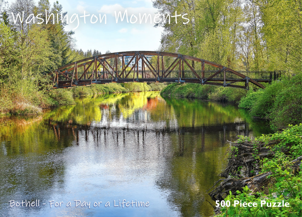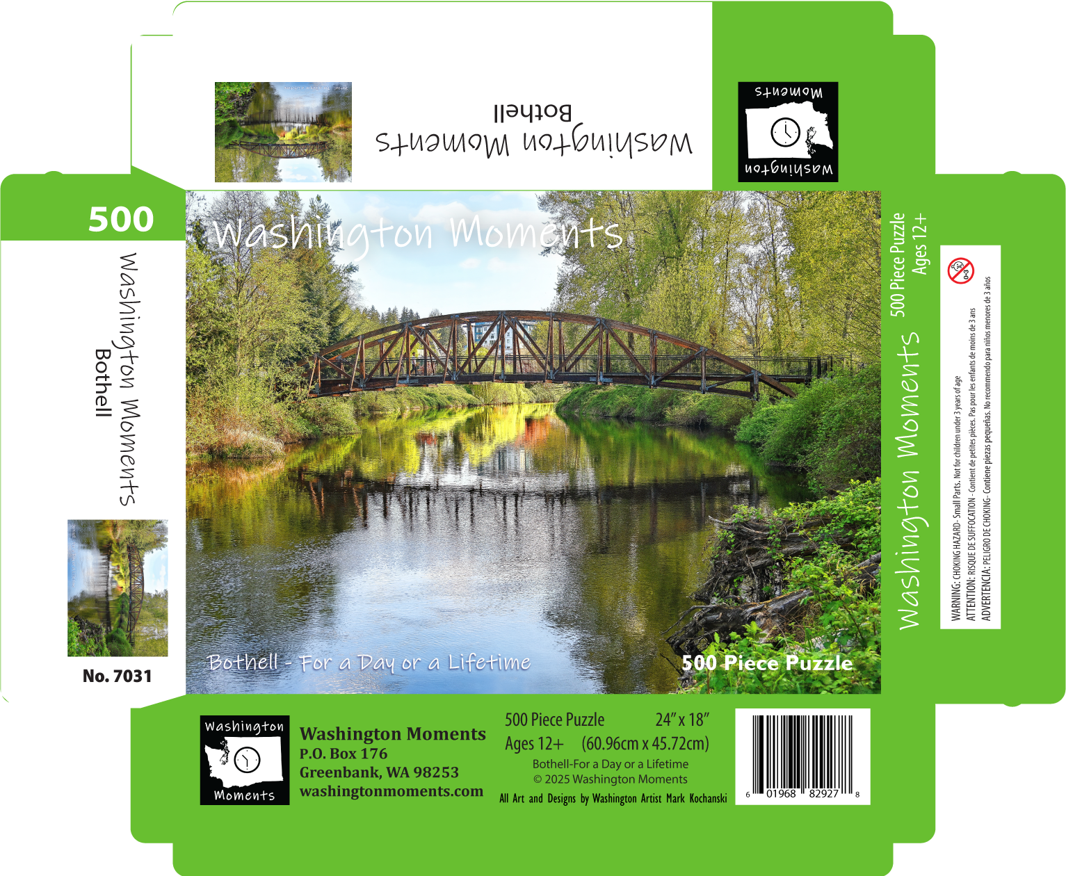 A 500-piece puzzle of the walking bridge over the Sammamish Slough the connects downtown Bothell to the Sammamish River Trail. Titled with Bothell’s small-town charming motto as a place “For a day or a lifetime”. The artist with his family lived and worked in Bothell for over 30 years.