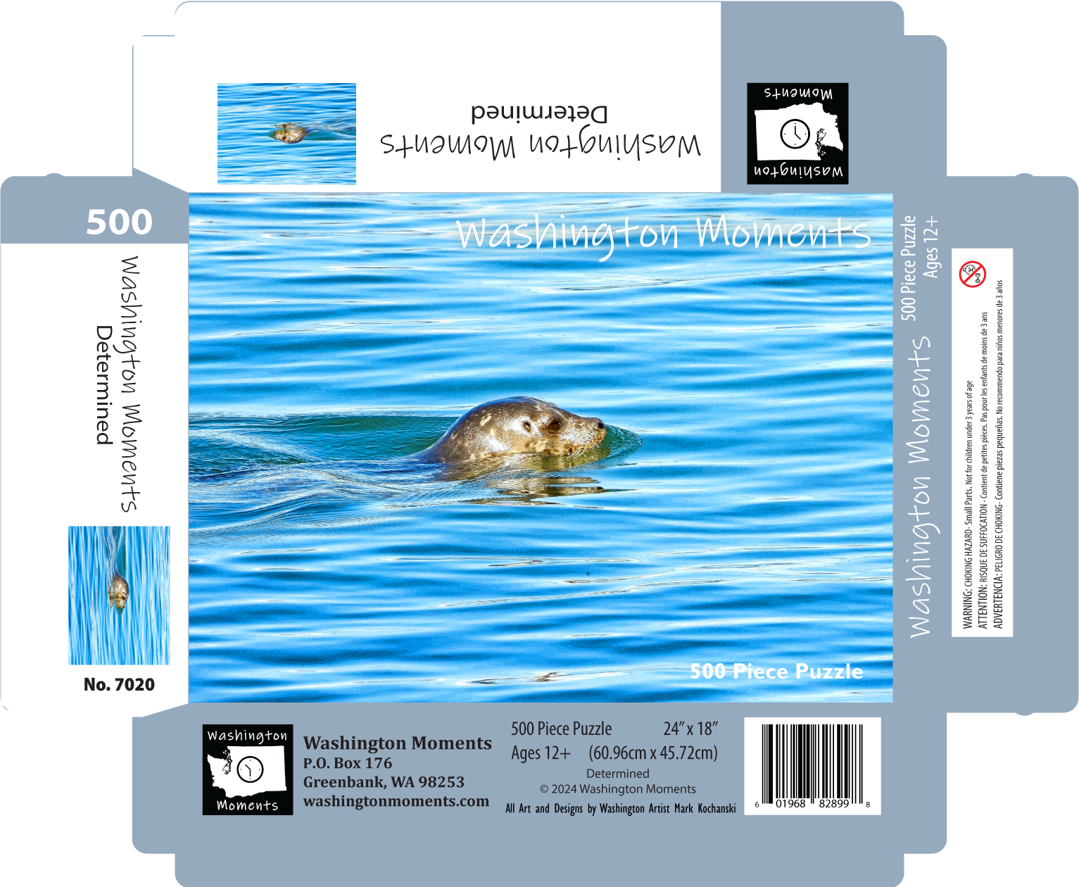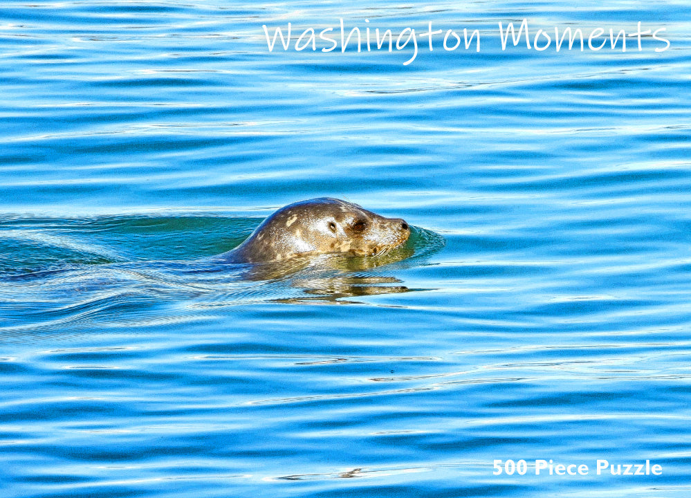 A 500-piece puzzle of a harbor seal swimming off Washington Park near Anaccortes, Washington. This seal appeared to be on a “mission” (determined).