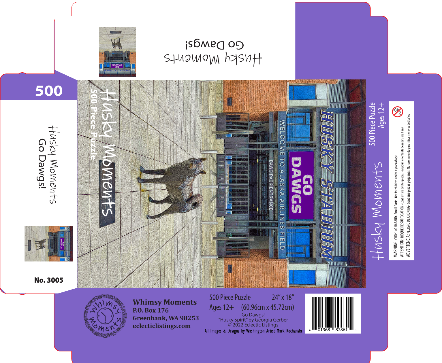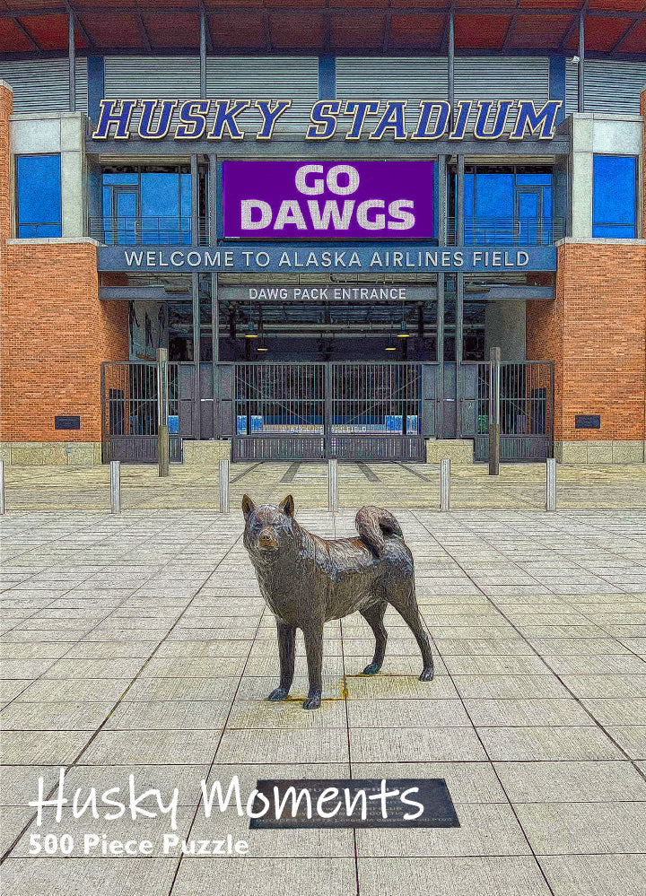 A 500-piece puzzle of the main entrance to Husky Stadium with the bronze statue “Husky Spirit” by Whidbey artist Georgia Gerber.