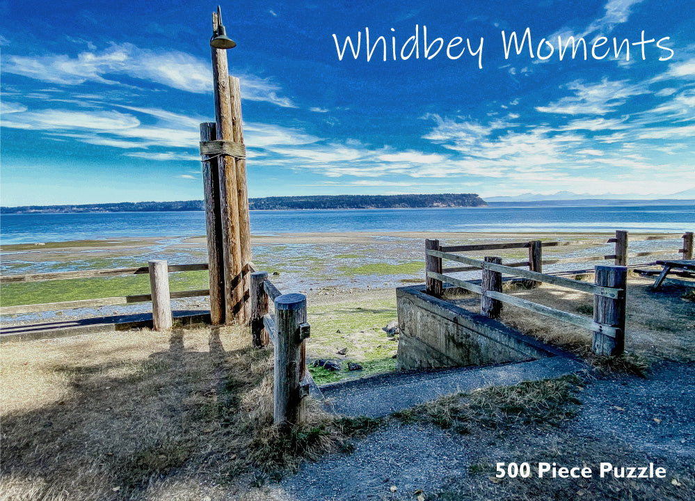 A 500-piece puzzle of the beach below downtown Langley looking toward Camino Island. The stretch of the Saratoga Passage provides common sightings orca and migrating gray whales. This scene is often mistaken to be being Double Bluff on the other side of the island.