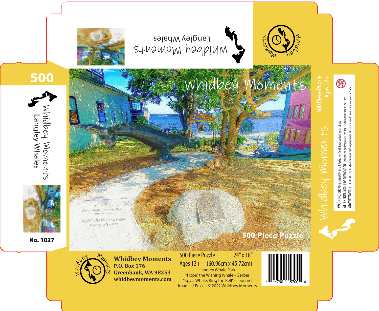 A 500-piece puzzle of the Whale Park in downtown Langley. Langley is popular location to watch for orcas and migrating gray whales as they pass through the Saratoga Passage. The park includes the whale sculpture, “Hope”, by Georgia Gerber and “Spy a Whale, Ring the Bell” installation by Tim Leonard.
