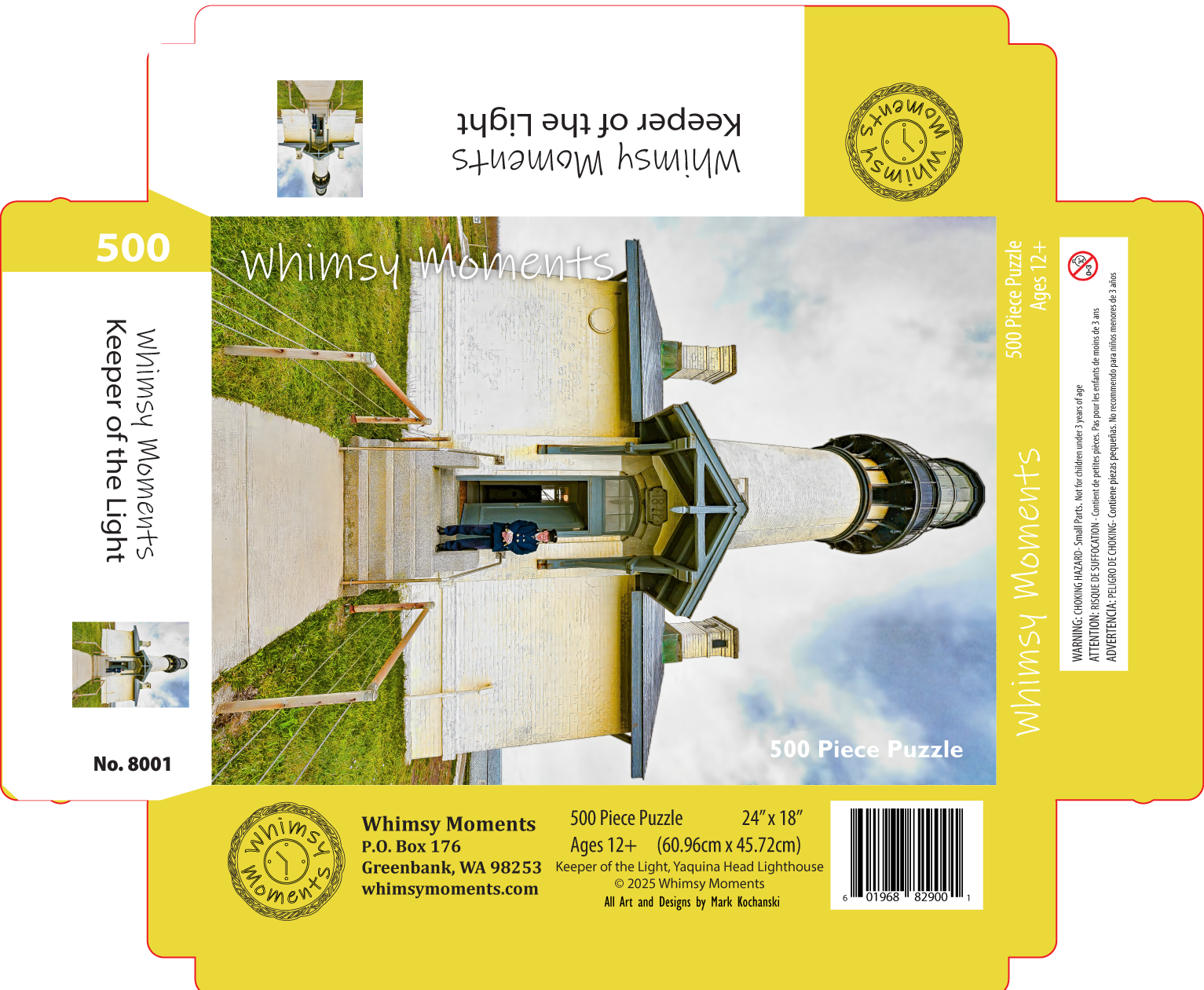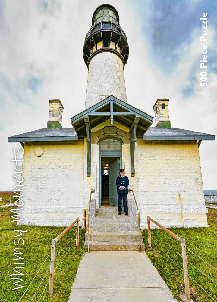 A 500-piece puzzle that reminds us of the past before automation when lighthouse keepers were important to the daily operation of our lighthouses. This lighthouse keeper stands in front the Yaquina Head Lighthouse just north of Newport, Oregon.