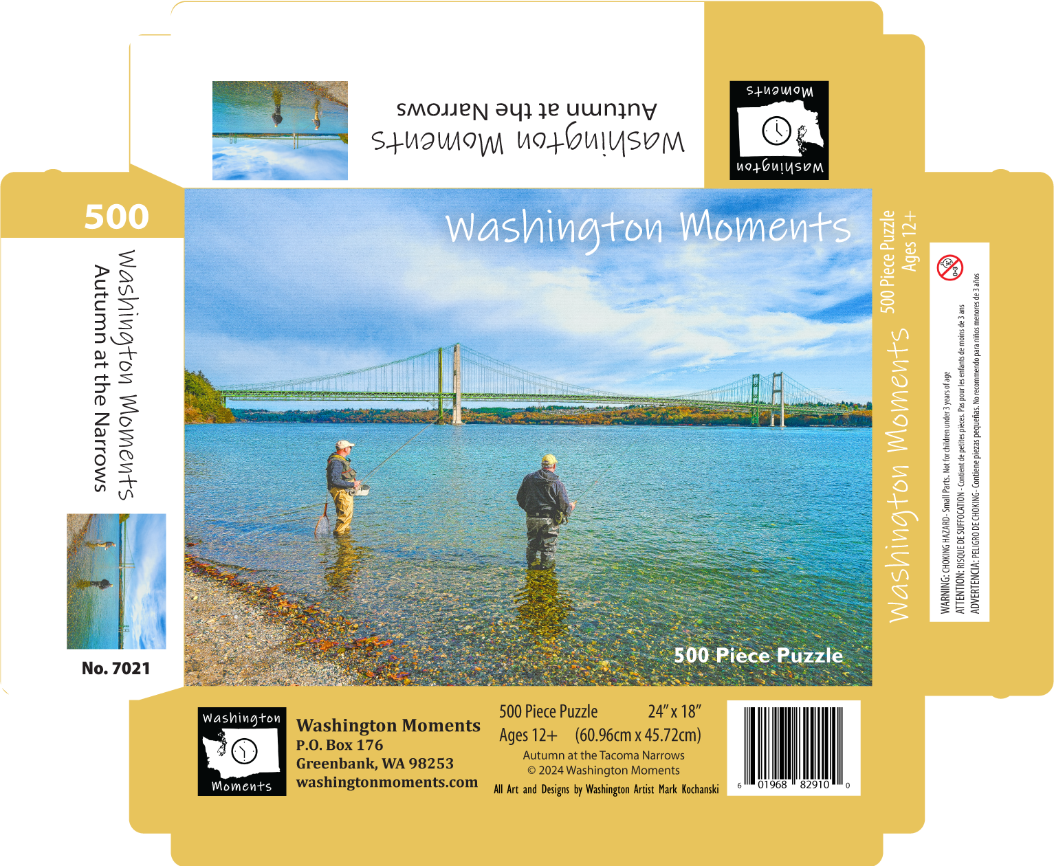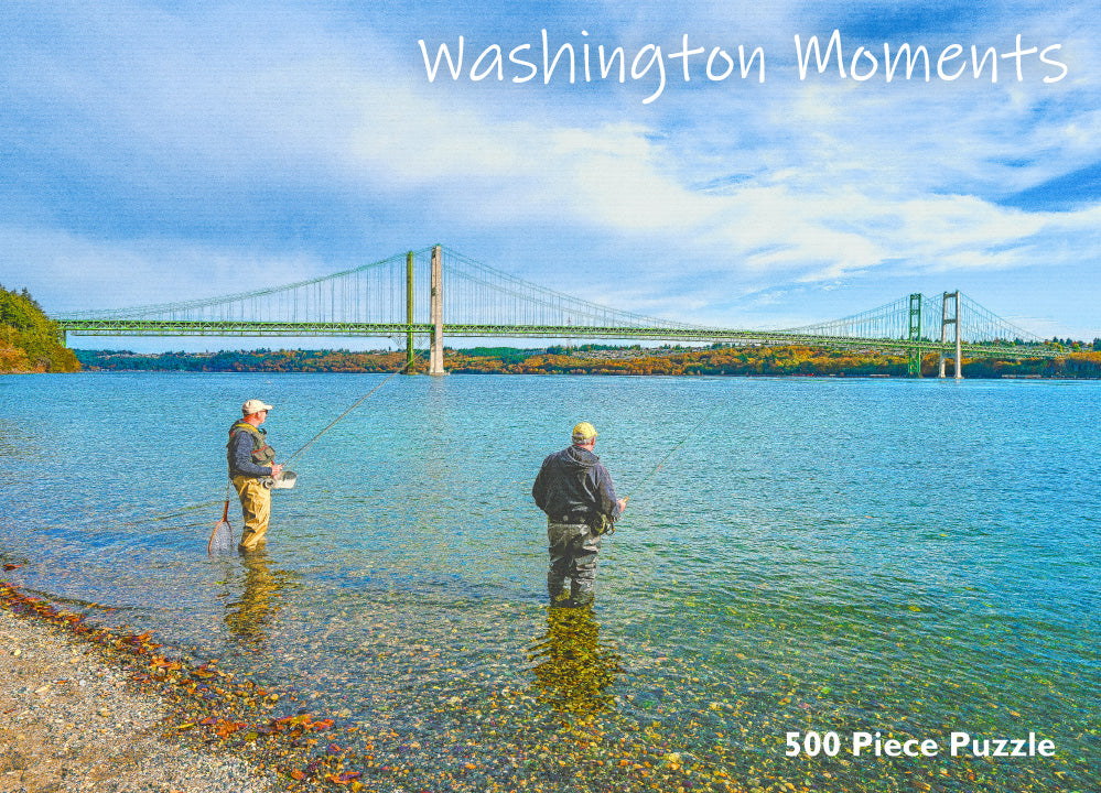 A 500-piece puzzle of the salmon fishermen during Autumn with the Tacoma Narrows bridge in the background that connects Tacoma to Gig Harbor.