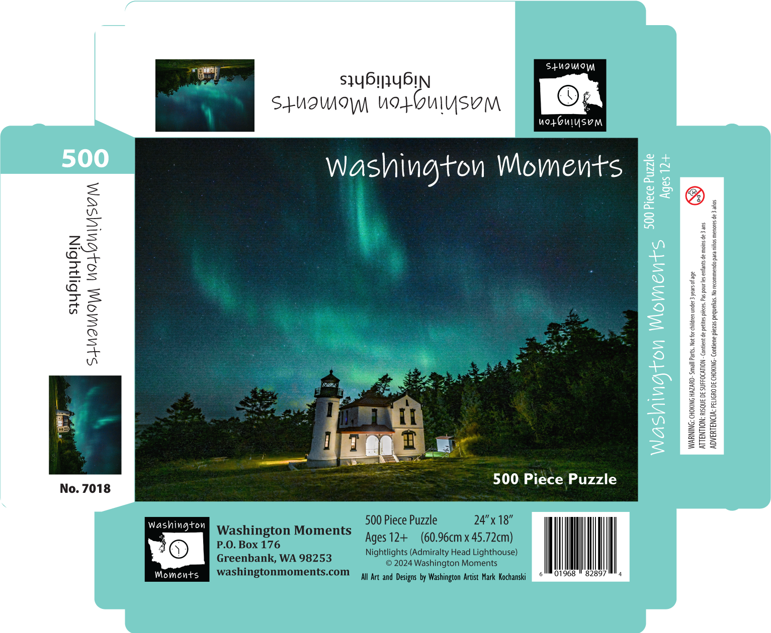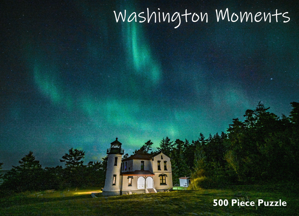 A 500-piece puzzle of the aurora over the Admiralty Head Lighthouse located in Fort Casey State Park near Coupeville, Washington taken during the October 2024 aurora event.