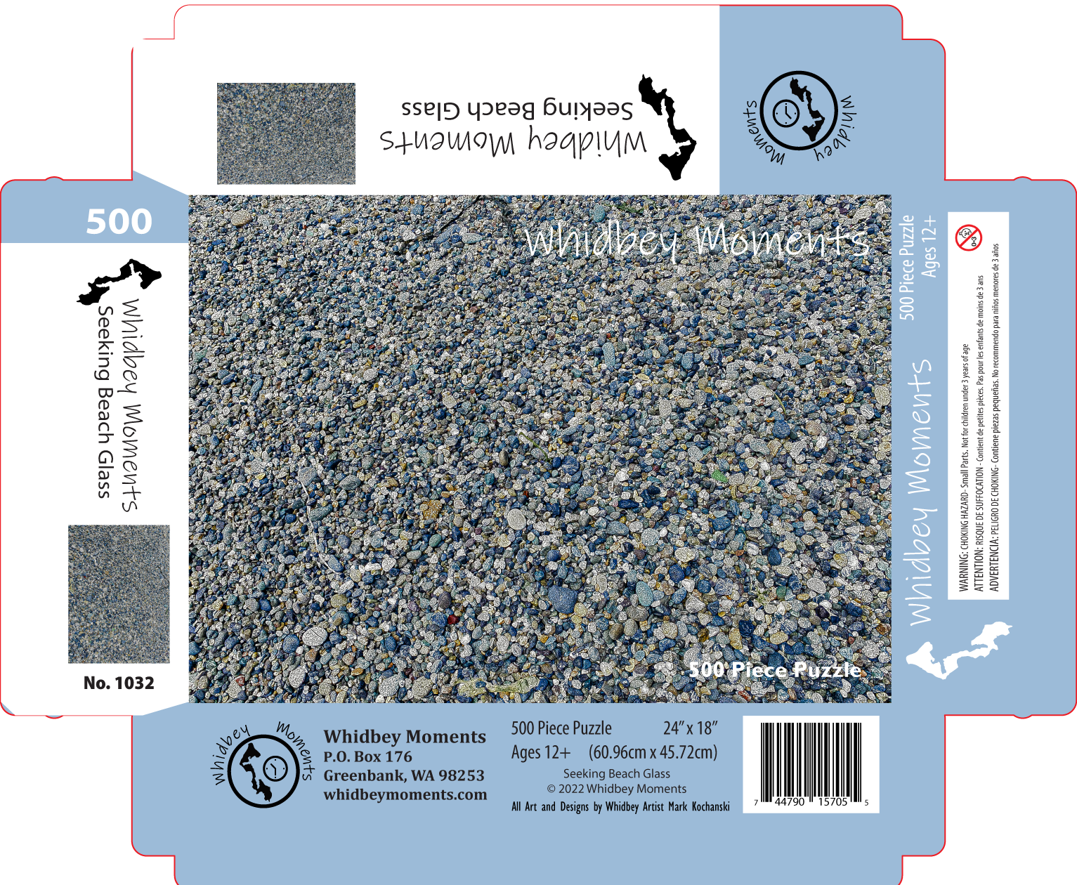 A 500-piece puzzle of beach gravel along the Admiralty Inlet where beachcombers often seek to find treasures of beach glass. This was our first “challenge” puzzle designed to be more difficult for people who like a more demanding puzzle to work.