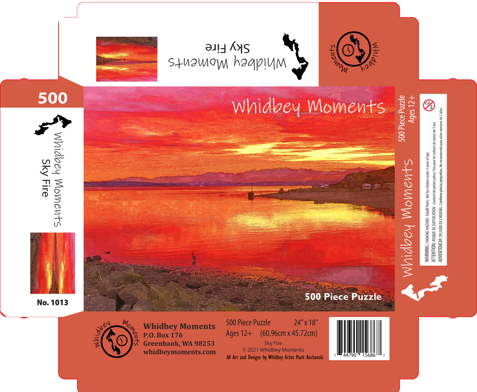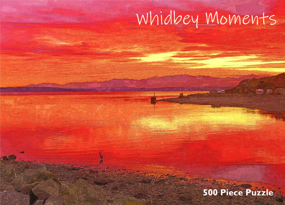 A 500-piece puzzle of a red “fire” sunset on the Admiralty Inlet and Olympic Mountain range captured from near the Keystone ferry dock.